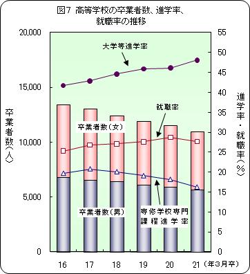 進路別の内訳をみると、大学等進学者5,277人、専修学校(専門課程)進学者1,784人、専修学校(一般課程)等入学者478人、公共職業能力開発 施設等入学者44人、就職者2,985人、一時的な仕事に就いた者95人、上記以外の者305人、死亡・不詳1人となっている。 大学等進学率は 48.1%で、前年度より2.0ポイント上昇している。 就職者総数は3,038人で、前年度より273人減少し、就職率は27.7%で、前年度より1.0ポイント低下している。 就職者総数のうち県内就職者 数は 2,293人で、前年度より217人減少し、県内就職率は75.5%で、前年度より 0.3ポイント低下している。 |
