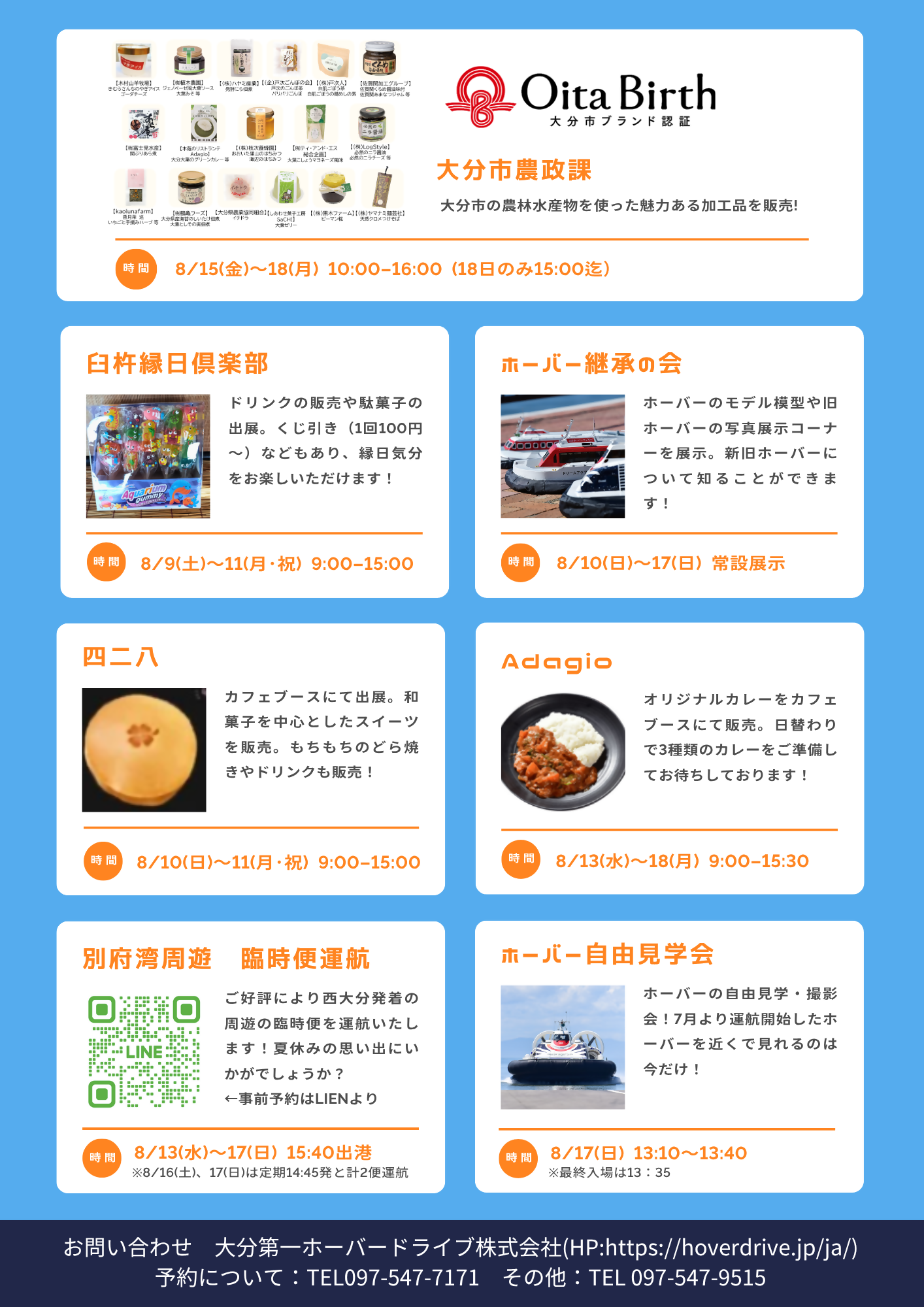8月17日には「ホーバー自由見学会」、8月13日から8月17日は「別府湾周遊の臨時便運航」も行います。