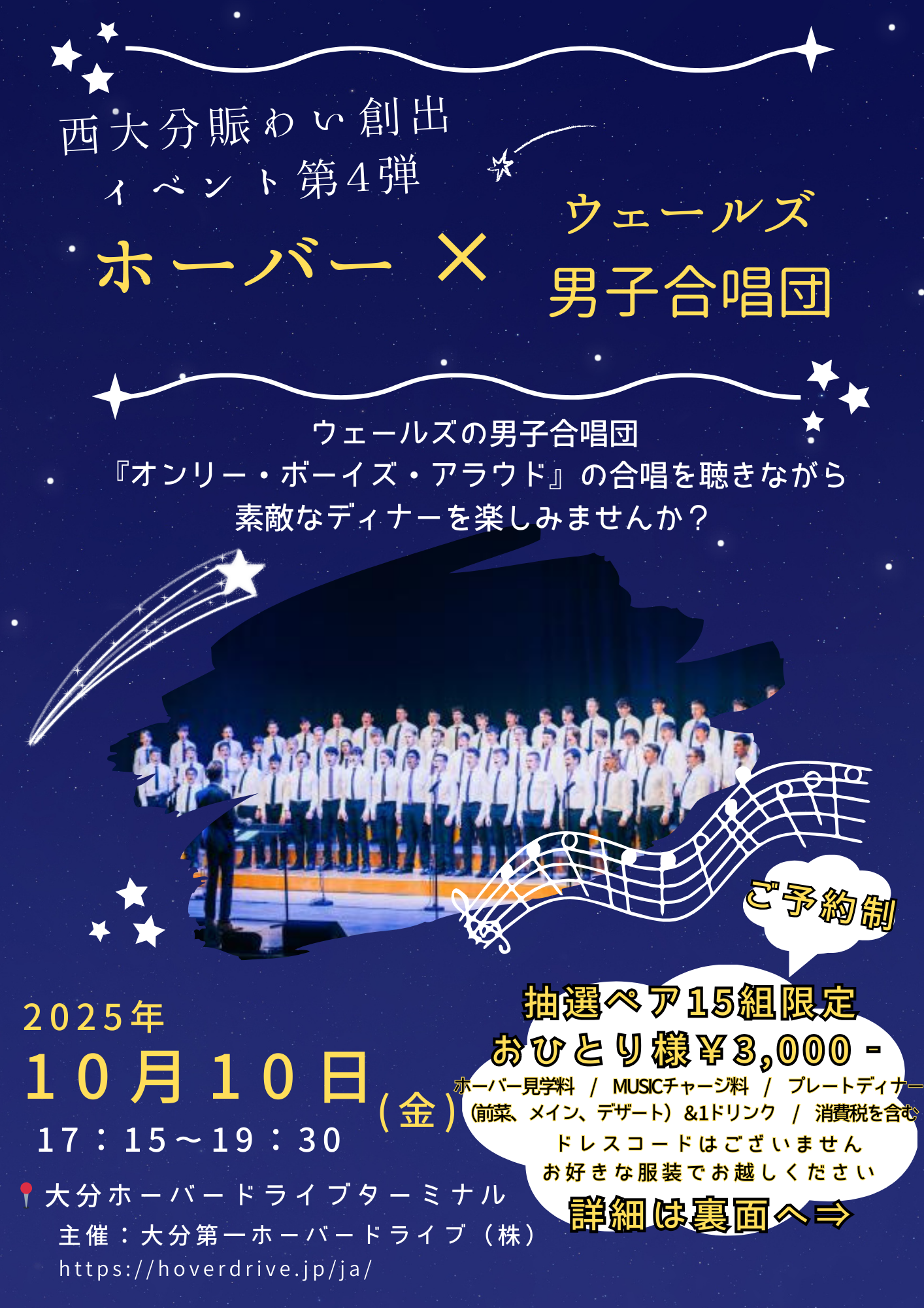 第四弾の今回は、10月10日に「ホーバー×ウェールズ男子合唱団」を実施します。ウェールズ男子合唱団(オンリー ボーイズ アラウド)の合唱を聴きながら素敵なディナーを楽しみませんか?