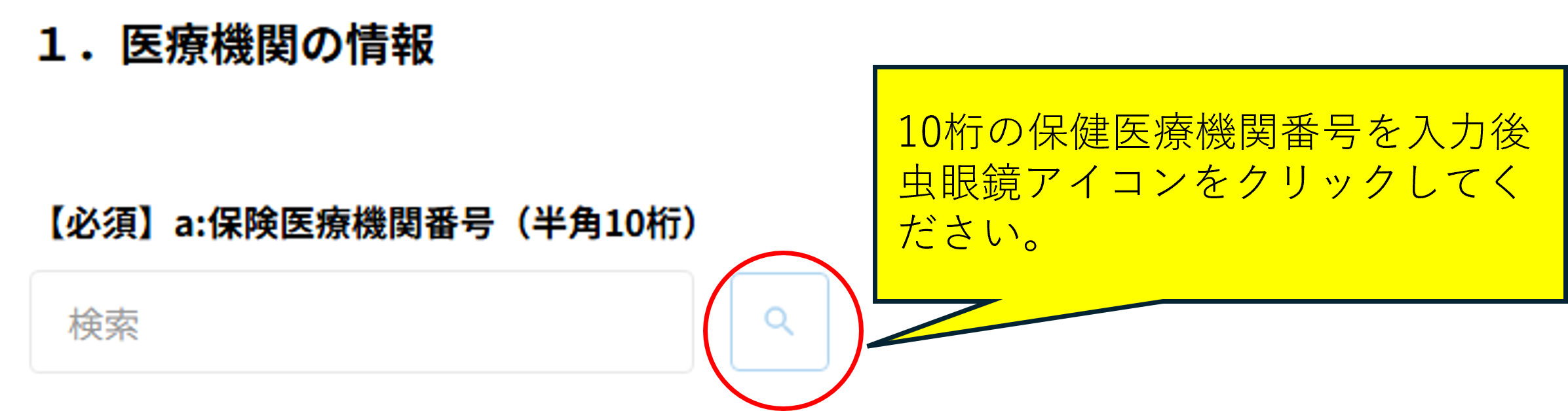 (1)入力フォーム冒頭に保健医療機関番号入力欄がありますので、入力の上で虫眼鏡アイコンをクリックしてください。