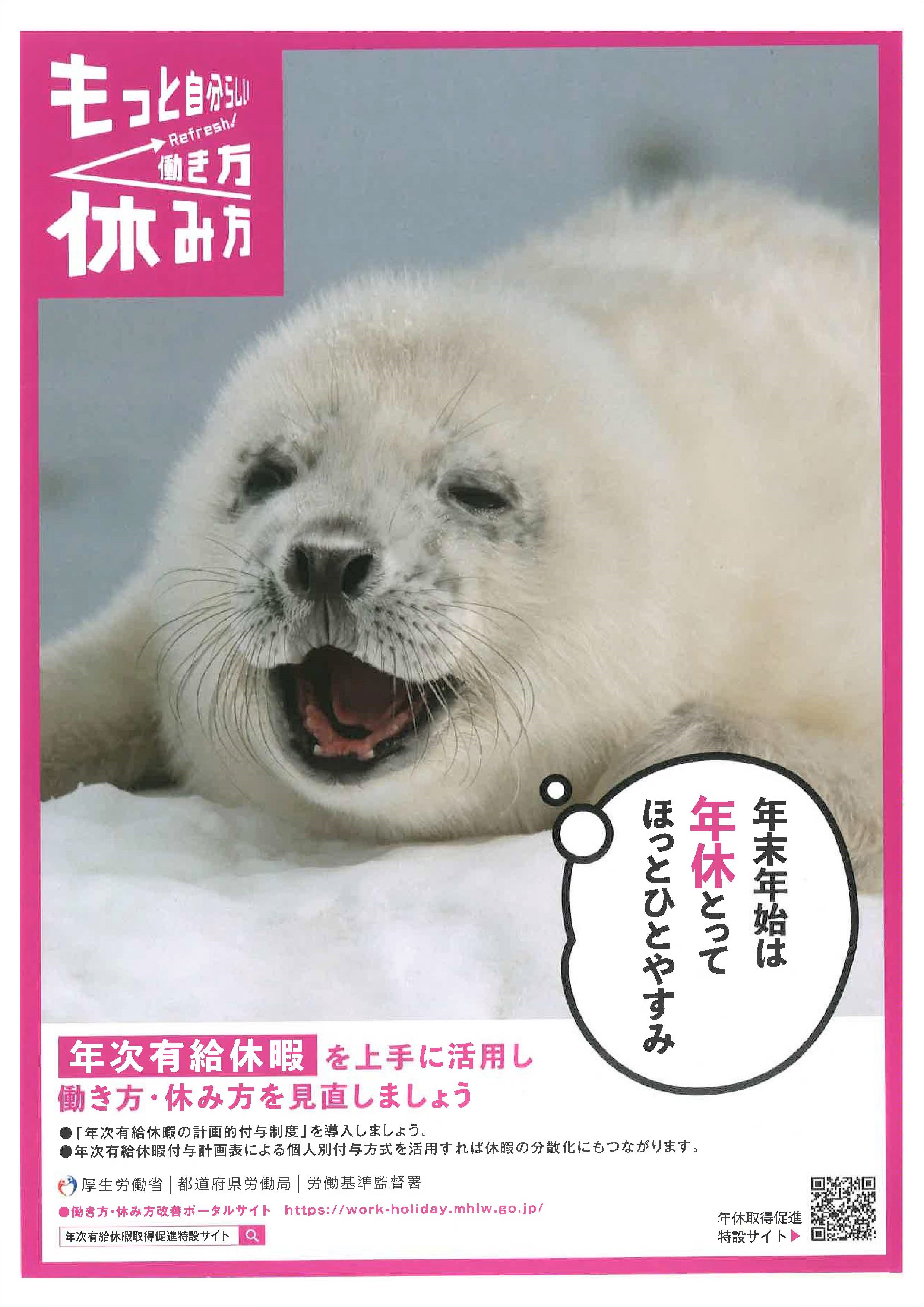 年末年始 働き方・休み方リーフレット [PDFファイル/435KB]はこちらからダウンロードして下さい。