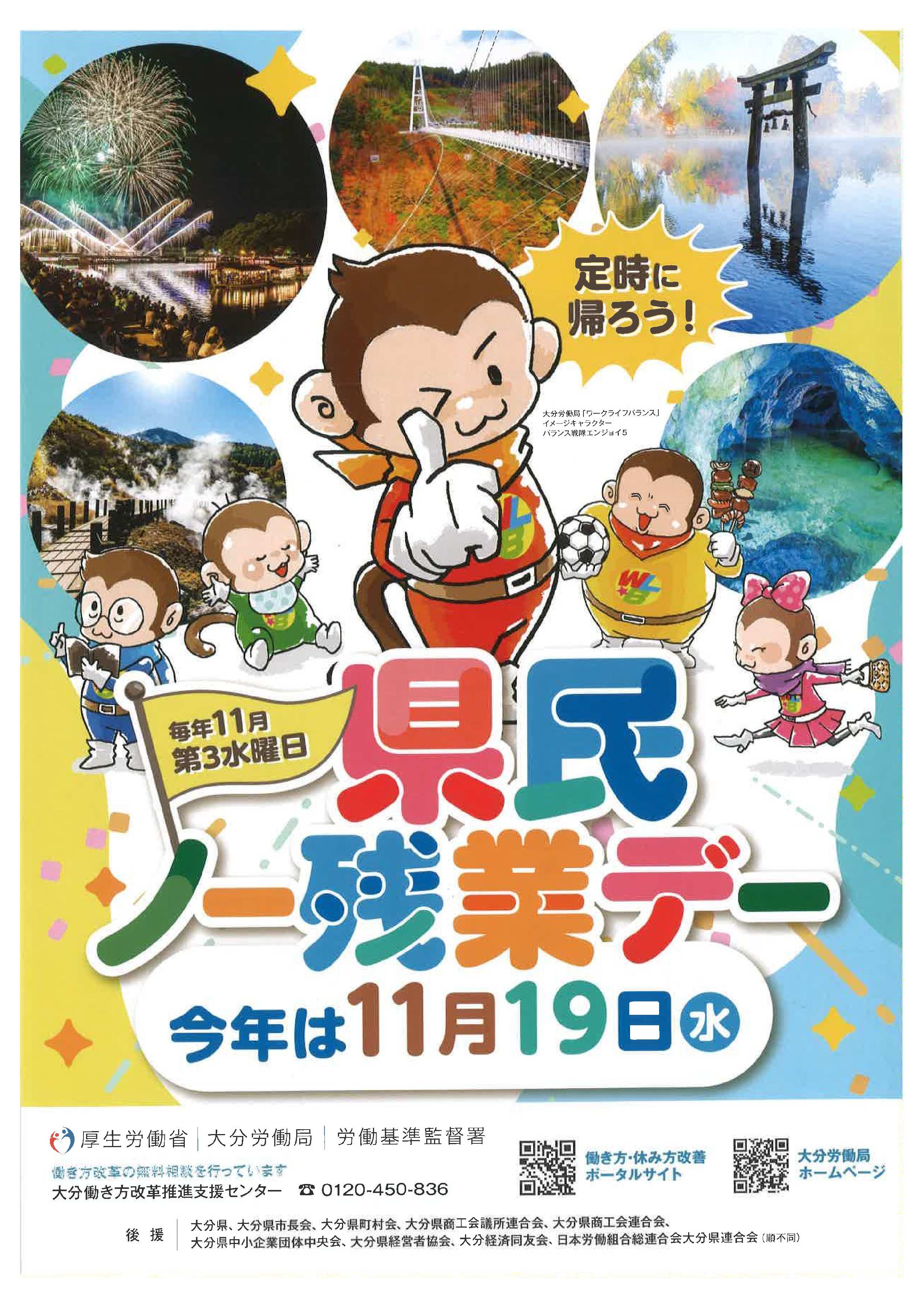 大分県と大分労働局では、11月の第3水曜日(今年度は11月19日)を「県民ノー残業デー」として掲げ、定時退社の取組を呼びかけています。
