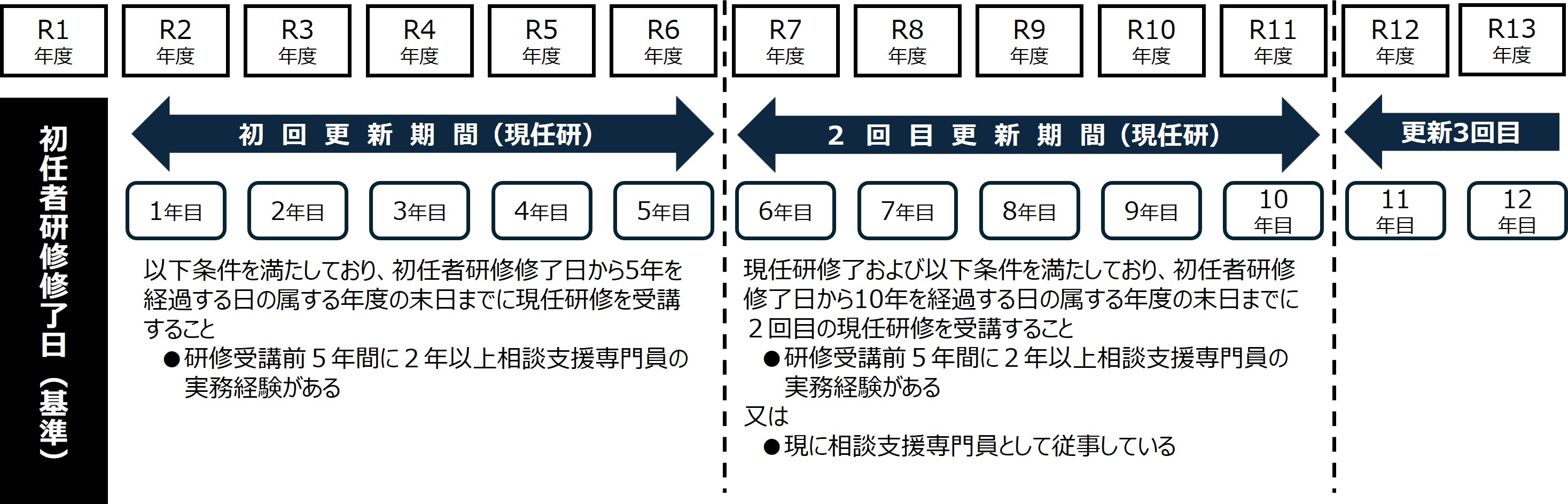 相談支援専門員の要件は、相談支援従事者初任者研修を修了した日の属する年度の翌年度を初年度とする同年度以降の5年度の間ごとの各年度の末日までに、現任研修を修了することとされている。この間に現任研修を修了していない者が再び相談支援専門員として業務を行う場合、初任者研修の受講を必要とする。