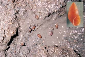 汽水域のヨシ原近くの泥地で,半ば埋もれた石の裏面や他の動物の生