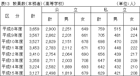 41,107人(男子20,872人うち専攻科104人、女子20,235人うち専攻科246人)で、前年度より1,411人減少している。学科別にみると、普通科24,041人(58.5%)、工業科5,290人(12.9%)、商業科4,174人(10.2%)の順となっている。 |