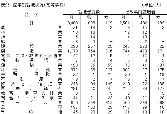 就職者総数は3,400人(男子1,998人、女子1,402人)で、前年より121人減少している。進学者及び入学者のうち就職している者は78人となっている。 |