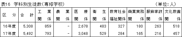 生徒数は、専修学校は5,492人(公立88人、私立5,404人)で、前年度より184人増加し、各種学校は2,390人(公立466人、私立1,924人)で、前年度より233人減少している。男女別にみると、専修学校は男子2,236人、女子3,256人、各種学校は男子1,231人、女子1,159人となっている。専修学校を学科別にみると、医療関係3,048人(55.5%)、工業関係793人 (14.4%)の順となっている。各種学校を課程別にみると、その他(全員自動車操 縦)1,716人(71.8%)、文化教養関係249人(10.4%)の順となっている。 |