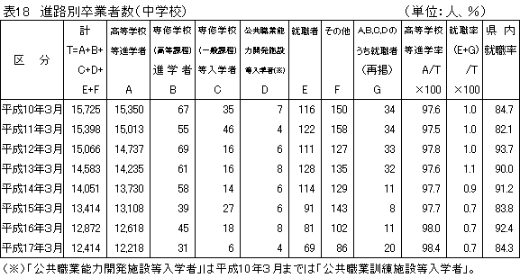 卒業者数は12,414人(男子6,428人、女子5,986人)で、前年より458人減少している。進路別の内訳をみると、高等学校等進学者12,218人(98.42%)、専修 学校(高等課程)進学者31人(0.25%)、専修学校(一般課程)等入学者6人(0.05%)、公共職業能力開発施設等入学者4人(0.03%)、就職者69人(0.56%)、その他86人(0.69%)となっている。 |