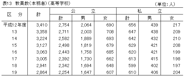 減少している。 課程別にみると、全日制63校、定時制1校、全日制・定時制併置校5校となっている。 また、本校分校別にみると、本校66校、分校3校となっている。 なお、公立のうち市立は1校で、他はすべて県立である。 |