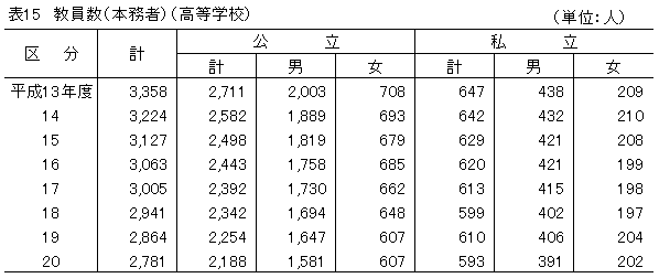 教員数(本務者)は2,781人(男子1,972人、女子809人)で、前年度より83人減少している。男女別にみると、前年度より男子教員は81人減少