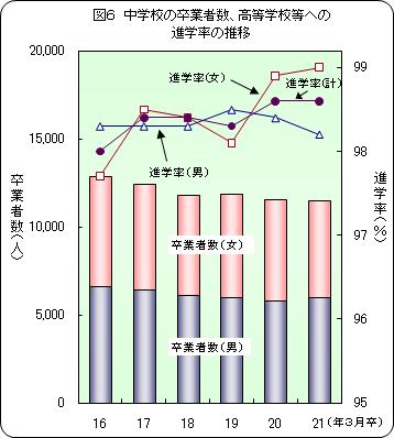 進路別の内訳をみると、高等学校等進学者11,350人、専修学校(高等課程)進学者5人、専修学校(一般課程)等入学者2人、公共職業能力開発施設等 入学者4人、就職者59人、上記以外の者90人、死亡・不詳1人となっている。 高等学校等進学率は98.6%で、前年度と同率である。 就職者総数は68人で、前年度より1人減少し、就職率は0.6%で、前年度と同率である。 就職者総数のうち県内就職者数は63人で、前年度と同数であり、県内就職率は92.6%で、前年度より1.3ポイント上昇している。 |