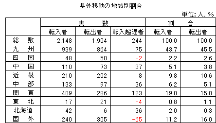 移動者(前住地、転出先不明を除く。)は7,182人で、県内移動者が3,130人、県外移動者が4,052人(転入者2,148人、転出者1,904人)となっており、244人の