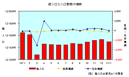 平成17年2月1日現在の総人口は1,214,906人(男572,543人、女642,363人)で、前月と比べ409人の減少となっています。 |