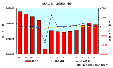平成19年12月1日現在の総人口は1,204,870人(男567,891人、女636,979人)で、前月と比べ