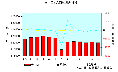 平成13年10月1日現在の総人口は1,220,061人(男575,198人、女644,863人)で、前月と比べ112人の減少となっています。
