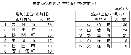 移動者(前住地、転出先不明を除く。)は4,492人で、県内移動者が1,289人、県外移動者が3,203人(転入者1,539人、転出者1,664人)となっており、125人の転出超過となっています。