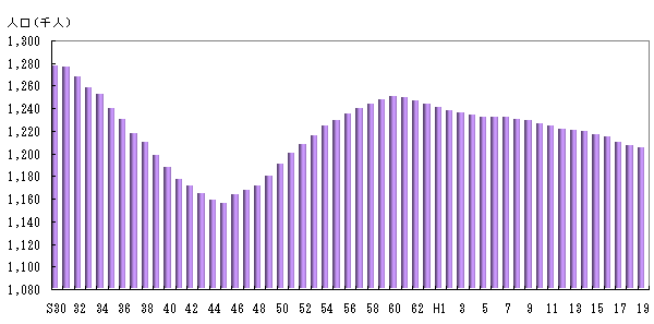 ■ 平成19年10月1日現在の総人口は1,204,772人 平成19年10月1日現在の総人口は1,204,772人で、前年と比べて1,402人(0.12%)減少した。 本県の人口は、昭和30年(1,277,199人)を最高に、以後減少を続けていたが、昭和46年には増加に転じ、昭和60年(1,250,214人)までは増加傾向が続いた。しかし、その後は再び減少に転じ、平成6年にわずかに増加したものの、現在まで減少傾向で推移している。〔図1・2,表1・3〕