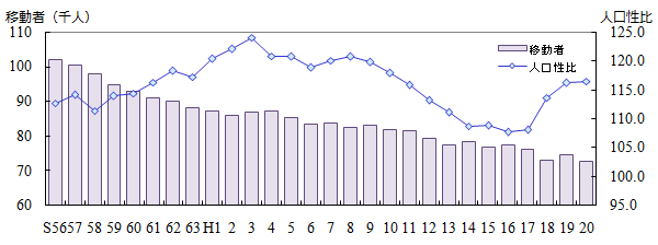 ■ 移動者総数は前年に比べ減少 この1年間の移動者総数は72,664人で、前年と比較すると 1,757人(2.40%)減少し、総移動率は6.05%である。 男女別にみると、男性は39,100人、女性は33,564人 で、人口性比は116.5である。移動者総数の人口性比は前年に比べて0.3ポイント増加した。平成3年をピークに多少の増減を繰り返しながら、男女の移 動者数の差は小さくなる傾向であったが、平成17年からは大きくなってきている。〔図6,表 10〕 |