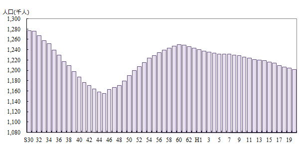 ■ 平成20年10月1日現在の総人口は1,201,715人 平成20年10月1日現在の総人口は1,201,715人で、 前年と比べて3,057人(0.25%)減少した。 本県の人口は、昭和30年(1,277,199人)を最高に、 以後減少を続けていたが、昭和46年には増加に転じ、昭和60年(1,250,214人)までは増加傾向が続いた。しかし、その後は再び減少に転じ、平成 6年にわずかに増加したものの、現在まで減少傾向で推移している。〔図1・2,表1・3〕