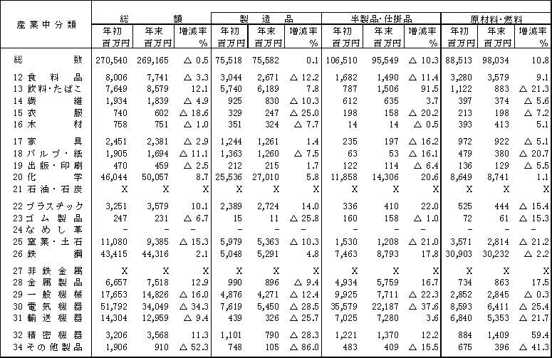 | 従業者30人以上の事業所の年末在庫額は2692億円で、年初に比べ14億円の減少となった。 形態別にみると、 製造品在庫額は、 1億円の増(年初比 0.1%増)