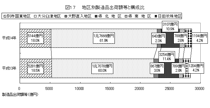 | 平成14年の製造品出荷額等は 2兆8542億円で、前年に比べ203億円の増(前年比 0.7%増)となり、2年ぶりに増加となった。(利用上の注意5(2)) | |