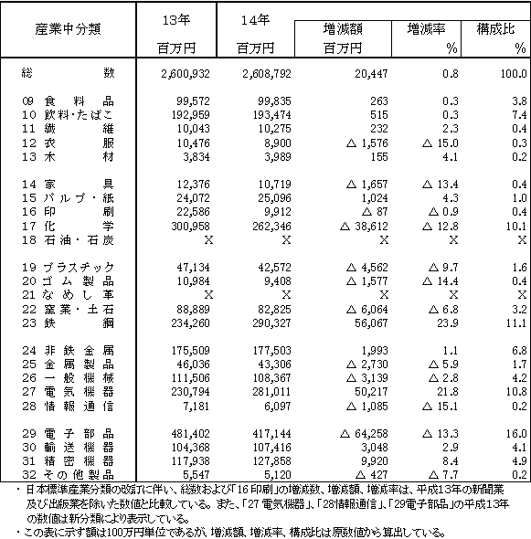 | 従業者30人以上の事業所の生産額は2兆6088億円で、前年に比べ204億円の増加(前年比 0.8%増)となった。鉄鋼は増加に転じたが、電子部品は昨年に続き減少した。(利用上の注意5(2)) | |||||||||||||||||