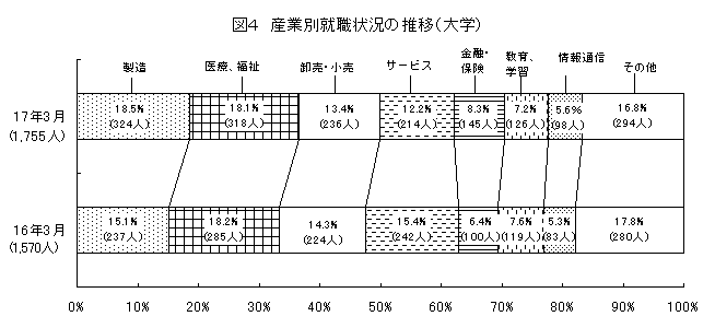 就職者の産業別就職状況をみると、製造業324人(18.5%)、医療、福祉318人(18.1%)、卸売・小売業236人(13.4%)、サービス業214人(12.2%)の順で、前年よりそれぞれ3.4ポイント上昇、0.1ポイント低下、0.9ポイント低下、3.2ポイント低下となっている。 |