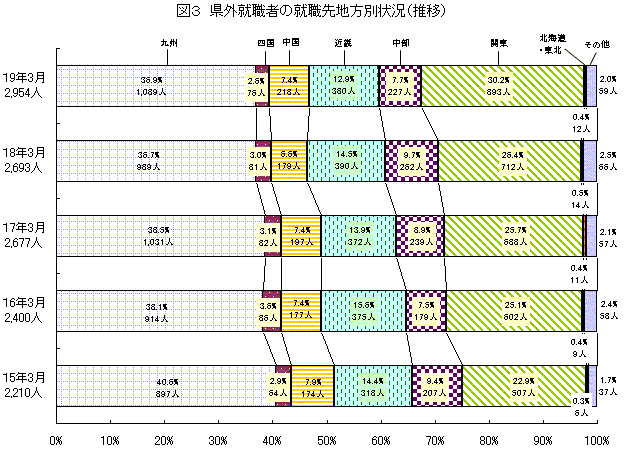 県外就職者を就職先地方別でみると、大学卒業者では関東への就職者が最も多く、その他の学校では九州に最も多く就職している。全体では、九州1,089人(36.9%)、関東893人(30.2%)、近畿380人(12.9%)、中部227人7.7%)の順となっている。