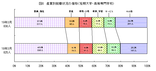 就職者の産業別就職状況をみると、医療、福祉317人(37.9%)、製造業90人(10.8%)、卸売・小売業79人(9.4%)、教育、学習支援業77人(9.2%)の順で、前年よりそれぞれ2.1ポイント低下、1.7ポイント上昇、0.4ポイント低下、1.6ポイント低下となっている。 県内就職者を産業別でみると、医療、福祉283人(45.0%)、教育、学習支援業62人(9.9%)、卸売・小売業57人(9.1%)、製造業54人(8.6%)の順で、前年よりそれぞれ1.4ポイント上昇、2.6ポイント低下、2.0ポイント低下、1.4ポイント上昇となっている。 |