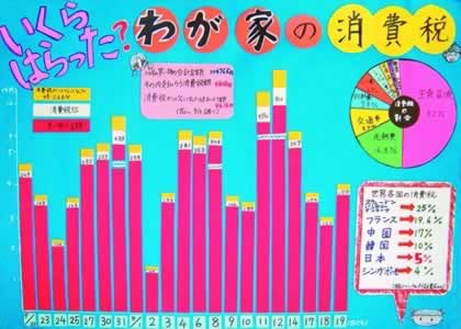 宇佐市立長峰小学校 6年 原田 由香里 自分の家の3週間の買い物と払った消費税についての統計をグラフに表わしながら、税率が10%になった場合や、外国の例も紹介しています。背景の色とタイトルやグラフの色の大胆な組み合わせが印象的です。 |