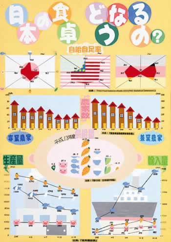 「日本の食卓どうなるの?」 大分県立鶴崎工業高等学校 佐藤 綾奈 自給自足率のレーダーチャートを各国の国旗を利用して構成しており、表現に工夫が見られます。輸入量が毎年伸びている分、生産量が毎年落ちていっているのがよくわかります。日本の現状がよくわかる統計のまとめかたです。