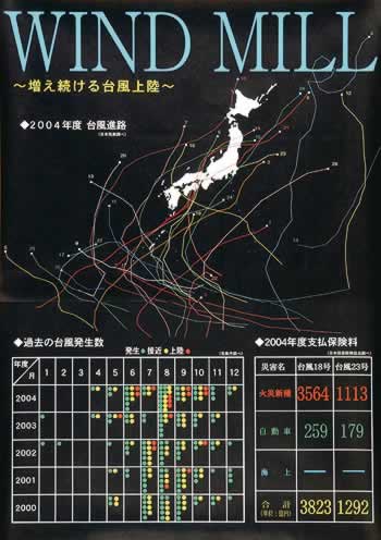 「WIND MILL 大分県立日出暘谷高等学校 河野 剛宏 昨年猛威を振るった台風の進路と発生率を黒バックに大胆にレイアウトしています。九州直近を多くの台風が通り過ぎたことがよくわかります。台風の進路が黒字によく映えており、機能とデザインが高いレベルで融合している作品です。