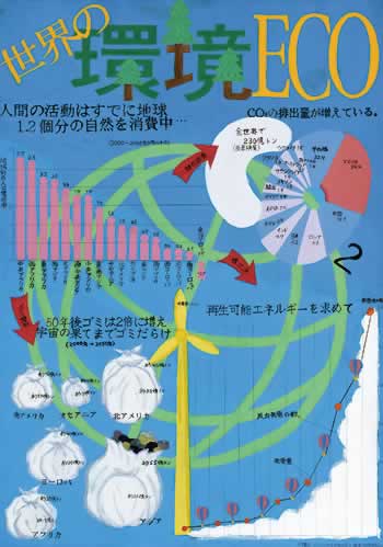 この部になってくると、社会的なメッセージを持つグラフが増えてきますがその良い例ですね。グラフにすることによって環境問題をより身近に感じることができます。題字も木の形をデザインに取り入れて面白い効果がでています。