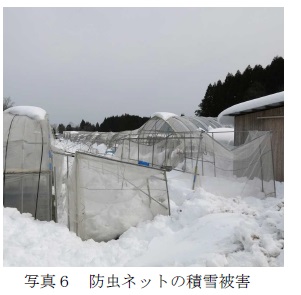 (ビニールを除去していない場合で)降雪が予想される場合は、屋根被覆資材の表面に雪の滑落を妨げるような資材等がないかを事前に点検し、除去する。害虫対策用のネットも必ず外しておく(写真6)。