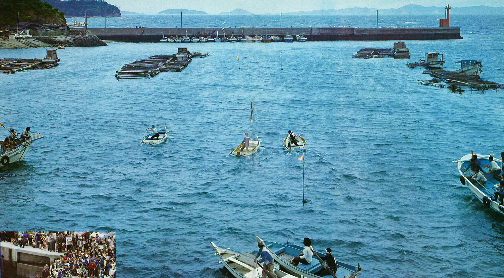 昭和50年4月26日の大分市佐賀関町下浦港は、朝から強い風が吹きつけ、港内の船は右に左に大きく揺れていた。その荒い波の上を一丁ろ(櫓)の和船が3そう単位で次々とこぎ出す。たくましい海の男たちの「おしぞめ大会」だ。この行事は、昭和20年ごろまで毎年正月に、にぎやかに行っていた漁船こぎ競争を、町の青年会議所が主催して、昭和50年に復活させたもの。当時は団体9組と個人30人が参加、各選手は往復60メートルの距離をこいで自慢の腕を競い合った。おしぞめの初まりは、昔、正月に旧佐賀関半島海岸の白が浜、黒が浜の石を権現様にお供えするのに先を競ったことによると伝えられており、漁船こぎ競争も四丁ろ、八丁ろの船を操っていたという。