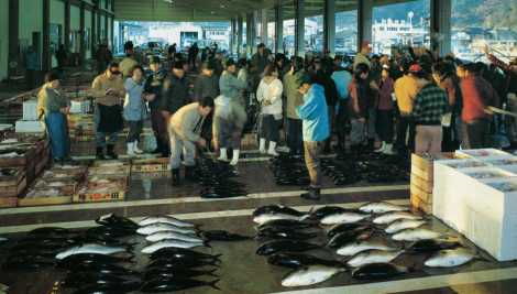 昭和52年12月1日にオープンした卸売市場。運営は地元の魚市場会社と県南漁連が共同出資した新会社があたっている。それまでの佐伯魚市場が木造で、売り場面積344平方メートルという小規模なものであったのに対し、新市場は売り場、管理棟、駐車場ともに数倍の広さ。大型冷凍冷蔵庫や排水処理施設も完備した近代的なものとなった。地域の水産振興、魚介類の流通合理化に大きな役割を果たすと期待された。