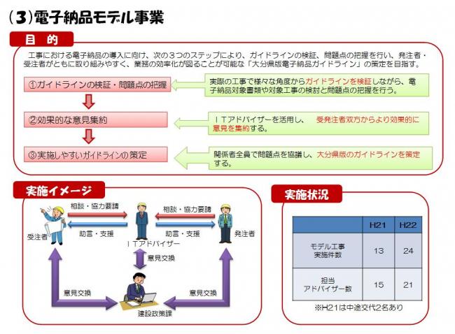 大分県土木建築部では、県内建設業者のみなさんの、電子入札導入に伴う機器やインターネット環境などのIT環境の整備を受けて、電子納品を始めとしたITを活用した業務の効率化、コストの縮減を図るための支援を行う事業として、「建設業IT化推進事業」に取り組んでいます。