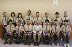 平成27年7月24日 7月28日から山口で開催される第23回スカウトジャンボリーに公益社団法人日本ボーイスカウト大分県連盟の団員が参加します。同連盟の戸高理事長ら14名が県庁を訪れ、連盟長である知事へ決意表明と出発のあいさつを行いました。 出発あいさつと概要説明のあと、スカウト一人一人から決意表明が行われ、「精一杯がんばりたい」「外国人との交流を深めたい」「英語を勉強したい」といった決意が述べられました。決意表明を受けて知事は、「この大会は世界中からたくさんの人が集まるので、この機会に世界の状況を知り、友情の輪を広げてください。熱中症には十分気をつけて、元気いっぱいのジャンボリーを期待しています」と激励を行いました。 |