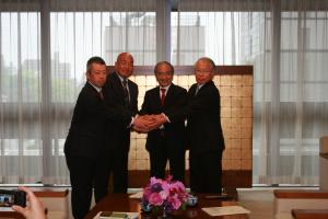 平成28年5月9日 株式会社くしふるの大地(親会社:(株)力の源カンパニー)が、玖珠町に農業参入することになり、同社の加島代表取締役ら2名と玖珠町の朝倉町長らが県庁を訪れ、協定の締結が行われました。 締結式で朝倉町長は「今後、できる限りのサポートをします」と挨拶し、知事は「玖珠町は昔から立派な農業をする土地ですが、株式会社くしふるの大地の参入で、さらに玖珠町の農業に磨きがかかることを期待しています」と挨拶しました。今後は地元の農家と共同で復刻米「くじゅう」などの生産を行う予定です。 |