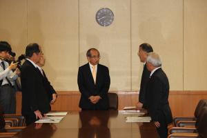 平成28年5月19日 平成28年4月16日発生の熊本地震被害に係る復旧・復興対策に関する県の補正予算等について、広瀬知事に対して、大分県議会、大分県市議会議長会及び大分県町村議会議長会が合同して緊急要望を行いました。 要望項目は、(1)被災者への支援、(2)社会インフラの早期完全復旧に向けた取組の強化及び関係機関への働きかけ、(3)観光・商工業・農林水産業等への支援、(4)観光客回復等への支援、(5)教育・文化財の復旧支援、(6)復旧・復興に向けての各種施策を通じた財政支援」の6項目です。 田中県議会議長は「このまま観光への風評被害が続けば、経営基盤が揺らぐ事態にまで発展しかねない」と指摘し、観光客の回復を図るため国土交通省が発行を検討する旅行クーポン券や、九州内の高速道路で無料化・割引の措置を実施するよう働きかけることを要望しました。知事は「痛手を受けた産業の営業面における復興も重要だと考えます。皆さんと力を合わせ、対応に万全を期していきたいです」と述べました。 |