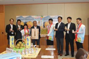 平成28年8月1日 日田梨の本格的な出荷が始まることから、生産者団体が今年度の生産、販売、輸出の取組状況を知事に報告しました。併せて、宝酒造株式会社から日田梨を使用した新商品「タカラCANチューハイ「直搾り」日本の農園から<大分産日田梨>」の発売報告が行われました。 宝酒造株式会社の渋谷支社長は「日田梨の果肉を丸ごとつぶし荒く搾ることで、しゃりしゃりした食感を出せました」とアピールしました。知事は「日田梨のさわやかな香りが良く、ジューシーで美味しいですね。皆さんのご尽力に敬意を表します」と挨拶しました。 また、JAおおいた日田梨部会の梶原部会長は「今年はここ10年で一番の出来です。缶酎ハイの商品化を機に、日田梨を全国に広めたいです」と抱負を述べました。 |
