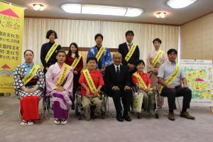 平成29年9月11日 国民文化祭、全国障害者芸術・文化祭の機運醸成を図るため、9月11日に「おおいた大茶会盛り上げ隊(PR隊)」を結成し、任命された隊員を、知事が激励しました。 隊を代表して扇子踊り娘の中津留萌絵さん(津久見市)は「大分県の魅力を具体的に広くPRしたいです」と挨拶しました。また、元気の出るアートの会の中島真一さん(日出町)は「沢山の方に楽しんでもらえるよう、まずは自分たちが楽しみながら活動しようと思います」と挨拶しました。知事は「存分に活躍して、国民文化祭、全国障害者芸術・文化祭を盛り上げて下さい」と激励しました。 「おおいた大茶会盛り上げ隊(PR隊)」は、各市町村の推薦で選ばれた、県内各地で伝統芸能の継承や芸術・文化活動、地域のPR活動に携わっている20人で構成されています。 |