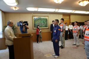 平成30年7月13日 平成30年7月の豪雨災害で、甚大な被害が発生している愛媛県宇和島市の災害応急対策を支援するため、大分県としても職員15名を現地に派遣します。派遣にあたり、出発式が行われました。 広瀬知事は「宇和島市では6,600戸が断水しており、皆さんには給水補助作業を行っていただくことになります。現地では困難な状況が続いていて、暑さもあり、大変な作業になるだろうと思います。健康に留意して、しっかりと責任を果たし、被災地の方々の期待に応えてください」と激励の言葉を述べました。これに対して行政企画課渡部主幹は、「テレビなどで、被災地の方々が家族を亡くされたり、大変なご苦労をされているのを目にします。大分県職員として、被災地の方々に貢献できるようしっかりとがんばりたいと思います」と述べました。 |
