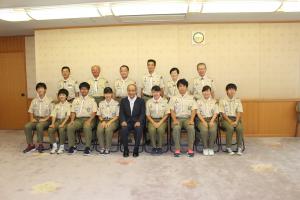 平成30年7月24日 8月4日から石川県で、各県のボーイスカウトとベンチャースカウトの代表が一堂に会する第17回日本スカウトジャンボリーが開催されます。このたび、大分県派遣団の皆さんが、日本ボーイスカウト大分県連盟長である知事に参加のあいさつを行いました。 戸高理事長は「子どもたちには、日頃の訓練の成果を発揮して、頑張ってほしい」、芳山派遣団長は「自信と誇りを持って参加してほしい」、後藤隊長は「子どもたちは、自ら「大分地獄おんせん隊」という名前を考え、大会で大分をPRしようと思っています。友達をたくさんつくり、日頃できない活動を楽しんでほしい」と述べました。班長の山形さんは「日頃会えない地域の仲間と交流を図り、大分県の魅力もPRしたい」と述べました。広瀬知事は「皆さん、一人一人からお話を伺うと、メンバーとして選ばれた責任と喜びを自覚し、積極的に活動しようとしていることを実感し、頼もしく感じます。全国の仲間と過ごすのは、宝のような時間だと思います。一回りも二回りも成長されることでしょう」と激励の言葉を述べました。 |