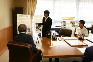 平成30年8月31日 次代を担う若年技術者の裾野の拡大や技能向上による就業促進を目的として開催される「第13回若年者ものづくり競技大会」で、大分県から出場した梅木康広さん(工科短期大学校2年)が、機械製図CAD職種で金賞(厚生労働大臣賞)を、飯田隼平さん(大分工業高等学校2年)が、同職種で銀賞を受賞しました。これに伴い、受賞者の2人と工科短期大学校長、大分工業高校長、指導教員ほか関係者が県庁を訪れ、知事に受賞を報告しました。 受賞した梅木さんは「この経験を活かし、これから産業界に貢献できるよう頑張りたい」と述べました。また、同じく受賞した飯田さんは「大きな自信になりました。部活動に一生懸命打ち込めたことが財産になりました」と述べました。知事は「受賞された皆さん、誠におめでとうございます。人口が減少し、人手不足のいま、一人ひとりの生産性を高めていくことが重要です。今回、見事な成果をあげていただいたことは、大分県にとっても誇らしいことです。これを機に、一段と自信をつけて、立派な技術者になってください」と激励の言葉を送りました。 |