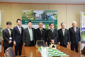 令和2年1月28日 国東半島宇佐地域世界農業遺産推進協議会では、世界農業遺産ブランドを活用したものづくり等による地域の元気づくりを進めるため、農林水産物等の地域ブランド認証制度を平成26年に創設し、運用しています。このうち、令和元年12月に新たに認証品目として追加された「茶の湯炭」に関して、株式会社陸栄国東製炭が初めて認証を受けたことに伴い、関係者が知事に報告を行いました。 国東市の三河明史市長は「クヌギの幹をしいたけの栽培に使い、枝を炭の原料として利用します。原木を有効活用できるので山がきれいになり、里山復活の一助になっています」と述べました。株式会社陸栄国東製炭の春山林生部長は「高品質な炭を生産できるのは、国東に質の高いクヌギがあるおかげだと思っています。「茶の湯炭」を通して、大分には良いクヌギがあるということも県外に発信していきたいです」と抱負を述べました。広瀬知事は「こんなにきれいな炭を見たのは初めてです。国東市は最近、海に山にご活躍中ですので、この「茶の湯炭」も大きな事業のひとつになるのではないでしょうか。期待しています」と激励の言葉を述べました。