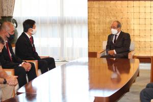 令和3年11月19日 神戸製鋼ラグビー部の「コベルコ神戸スティーラーズ」は、ジャパンラグビーリーグワンの開幕を前に、11月18日~28日まで大分で初めての合宿を行うことになり、ディレクターやキャプテン等チーム関係者が大分県庁を訪れ、知事を表敬訪問しました。 ディレクターの楠山泰司氏は、「このような素晴らしい土地でキャンプが出来てうれしい。コロナも落ち着いてきており、有観客で(練習)試合が出来、これは選手にとっても良いことだと思っている。我々はワクワクするラグビーを目指しており、皆さんにもキャンプ(試合)を見に来て欲しい」と話しました。チームディレクターの福本正幸氏は、「2019年のラブビーワールドカップの際に、大分の方々にラグビーは身近になったと思う。大分の子供達にラグビーが根付けばと思っている」と話し、また、ディレクターオブラグビーのウェイン・スミス氏は、「ラグビーが好きな人が多い大分でキャンプが出来てうれしい。ワールドカップでは、イタリアチームに帯同して来県したが、その際、試合場、練習場とも素晴らしい環境だと思った。このような素晴らしい環境を与えていただいてありがたい」と感謝の言葉を述べました。 広瀬知事は、「コベルコ神戸スティーラーズの皆さんを心から歓迎する。合宿会場となる駄原球技場は、ラグビーワールドカップの際にフランスチームの練習場として使っていただいた場所で、皆さんにも満足していただけるのではないかと思っている。是非大分での合宿が実りあるものになるよう願っている。私達に出来ることがあれば、何なりと申しつけて欲しい」と歓迎の意を表しました。