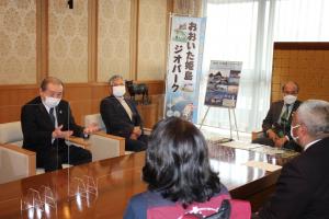 令和4年2月2日 大分県には、日本ジオパークに認定されている「おおいた姫島」と「おおいた豊後大野」の2つのジオパークあり、4年ごとに再認定を受ける必要があります。2回目のジオパーク認定の審査結果が1月28日にあり、両ジオパークとも再認定であったことから、おおいた姫島ジオパーク推進協議会とおおいた豊後大野ジオパーク推進協議会の関係者が県庁を訪れ、知事に審査結果の報告をしました。 おおいた豊後大野ジオパーク推進協議会会長の川野文敏氏は、「皆さんのおかげで日本ジオパークの再認定を受けることができた。県の皆様のご協力も大きかったと思う。ジオガイドは、豊後大野ジオパークを訪れてくださった方々に、おもてなしの心を持ってガイドしており、また、ジオパークの認定は、子供達の学びの推進にもなっている。拠点施設となる資料館の完成も再認定の追い風となった。資料館に来ていただければ、ジオパークの全てがわかるので、皆様にも是非訪れていただきたい」と述べました。 広瀬知事は、「ジオパークは費用対効果が高く、姫島・豊後大野そろっての再認定に心からお喜びを申し上げたい。ジオパークには認定基準があり、おいそれと認可されるものではない。子どもから老人までジオパークの意味について勉強、価値を自覚し、お客さんにガイドしているところが審査員の心を打ったのだと思う。今後は、要望のあったアドベンチャーガイドの認定を行うなどし、アドベンチャーツーリズムの実現に向けて応援したいと思っている」と述べました。