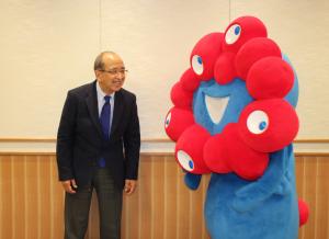 令和5年1月20日 2025年に大阪で開催が予定されている大阪・関西万博のPRのため、大阪・関西万博を運営する(公社)2025年日本国際博覧会協会の髙科淳副事務総長と経済産業省の澤井俊大臣官房審議官、大阪・関西万博公式キャラクターの「ミャクミャク」が県庁を訪れ、知事を表敬しました。 大阪・関西万博は、2025年4月13日(日)~10月13日(月・祝)までの184日間、大阪府の夢洲(ゆめしま)を会場に開催され、全体テーマは「いのち輝く未来社会のデザイン」です。テーマ事業として、「いのちの輝きプロジェクト」を企画しており、各界のトップランナー8人が自ら創り上げるテーマ事業を「シグネチャーパビリオン」で表現します。また、大阪・関西万博が掲げる目標は、「持続可能な開発目標(SDGs)達成への貢献」と「日本の国家戦略Society5.0の実現」です。 髙科副事務総長は、「開催まであと2年あまりとなりました。全国的な機運の醸成を図り、万博を全国の方々に知っていただくため、最初に大分県へPRに参りました。大分県から、子どもたちの修学旅行や校外学習等、様々な形でお越しいただければと思っています。会場は、海に面しているので、別府からフェリーで来ていただくと便利かと思います。万博では、空飛ぶクルマなども発表しますので、新しい事業のきっかけとなればと期待しています。」と話しました。 広瀬知事は、「せっかくの万博を逃さないように、事前に勉強をしないといけないと思います。子どもたちとワクワク感を持って待ちたいです。また、万博会場と大分は海でつながっているので、我々にとってもインバウンドなど観光振興のチャンスだと思います。これからもしっかりと連携させていただきたいです。」と万博開催に期待感を示しました。