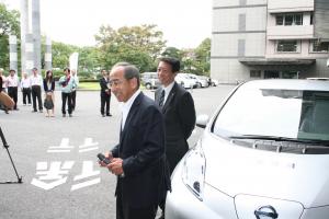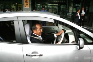 平成23年10月4日 県の公用車に電気自動車1台が導入されることとなり、知事が試乗しました。知事は「ハンドルが軽く、静かすぎるくらい静かな車で、あと何キロ走れるというメーターも目新しいですね。久しぶりでしたが気持ちよく運転できました。二酸化炭素を排出しないこの車を、地球環境問題の啓発などにも活用していきたいですね」と述べました。